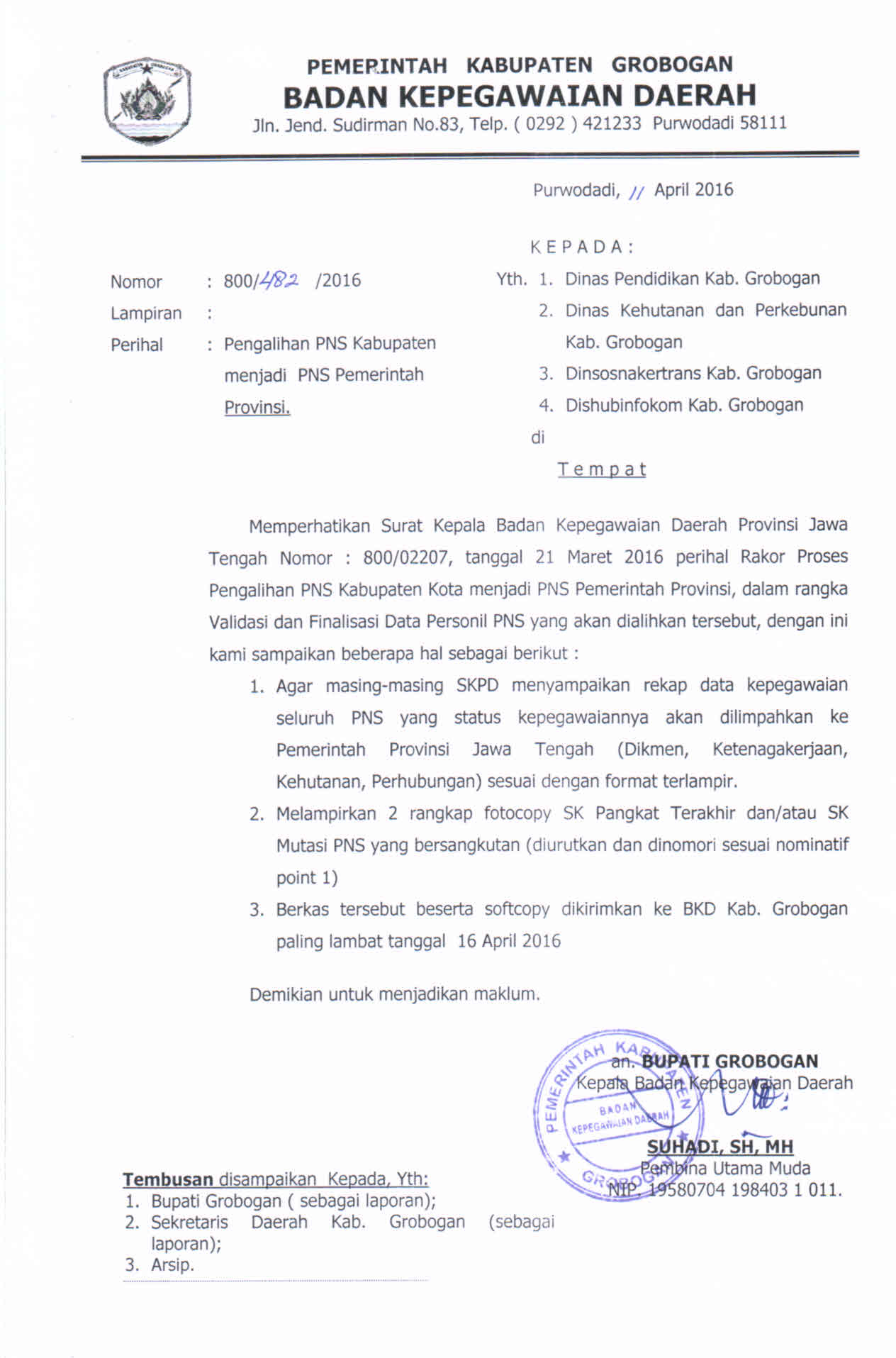 Surat Pengalihan PNS Kabupaten menjadi PNS Pemerintah Provinsi
