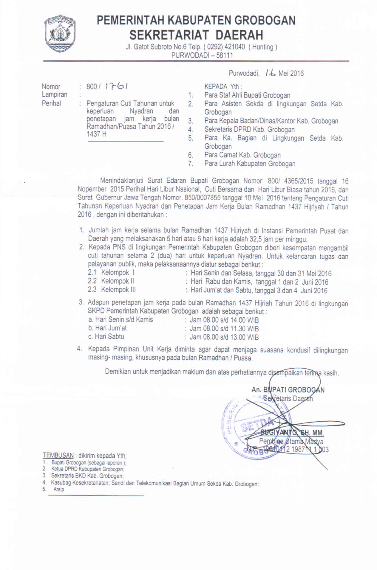 Pengaturan Cuti Tahunan Untuk Keperluan Nyadran Dan Penetapan Jam Kerja Bulan Puasa Tahun 2016